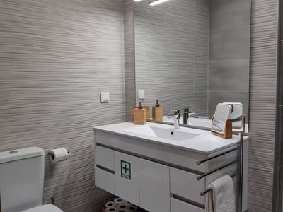 • A casa de banho fica localizada no rés-do-chão e possui uma espaçosa zona de duche. É também equipada com produtos de higiene pessoal gratuitos, secador de cabelos e kit de primeiros socorros, para além de um conjunto de toalhas para cada hóspede.